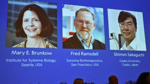 2025年10月6日星期一,瑞典斯德哥尔摩卡罗林斯卡研究所诺贝尔大会现场,屏幕上展示着玛丽·E·布伦考、弗雷德·拉姆斯代尔和坂口志门三位诺贝尔生理学或医学奖得主的照片。(图源:美联社)