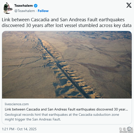 但琼斯也认同表示,如果两条断层确实存在联动关系,其实也合乎逻辑:「我不会很意外在卡斯卡迪亚地震之后,立刻看到圣安地列斯的地震。」。
