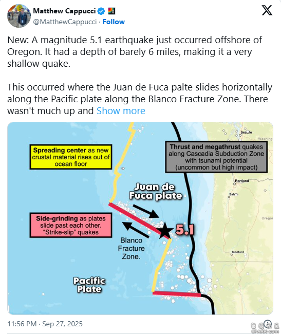 他与研究团队发现,强震不仅影响北方地区,也可能波及更南方的圣安地列斯断层,两条断层在加州门多西诺角(Cape Mendocino)附近交会,这也是地震学家特别关注的区域。