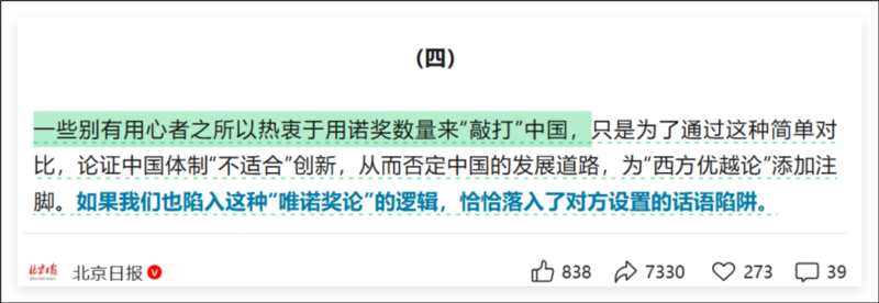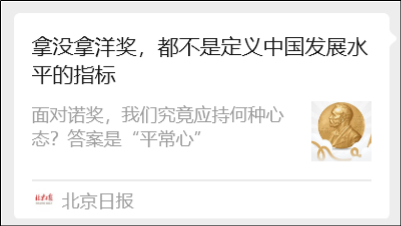 现在北京日报出了一篇文章叫:《拿没拿洋奖,都不是定义中国发展水平的指标》