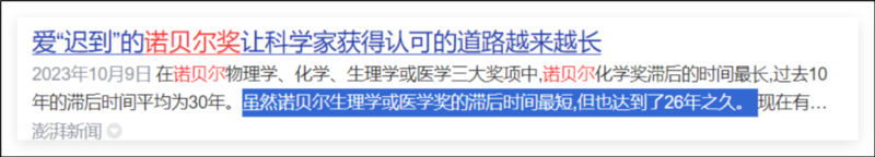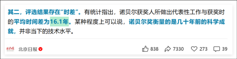 我不知道“诺贝尔获奖人所做出代表性工作与获奖时的平均时间差为16.1年”这个数据哪里来的。
