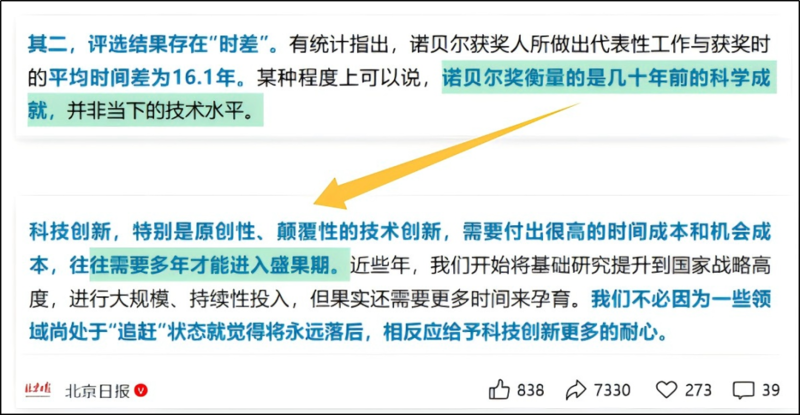 接着看,说评选结果存在“时差”,理由是评价几十年的成果,跟当下科技发展水平关系不大。