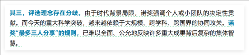 最离谱的是说评选理念存在分歧,理由是诺奖是几个人评出来的,这几个人根本不了解那些很大规模的学术成果,忽视了那些集体智慧。