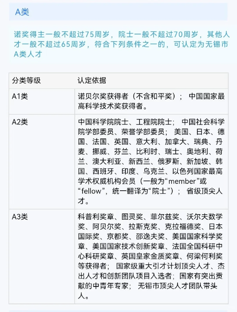 像无锡A类人才评选中,哪怕号称计算机领域诺奖的图灵奖,和号称数学领域诺奖的菲尔茨奖,都排在省级顶尖人才之下,侥幸和市级人才坐一桌。