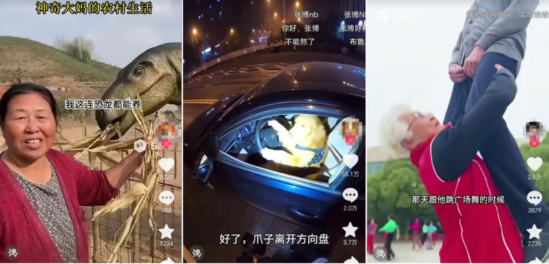 有人在视频里养老虎和恐龙,就有狗在违章驾驶时试图逃逸,还有老人在“单手举老伴”运动后,发现自己是AI。