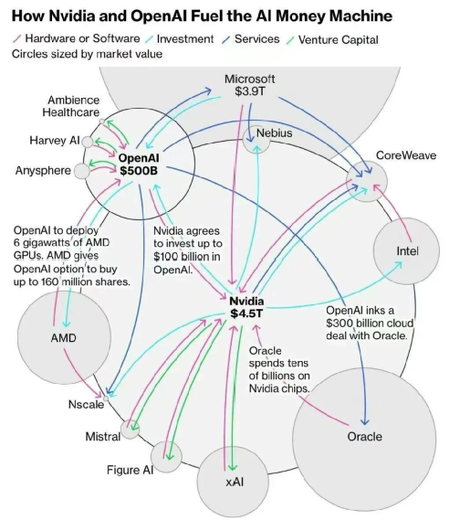 图注:OpenAI、甲骨文与英伟达的资本循环。