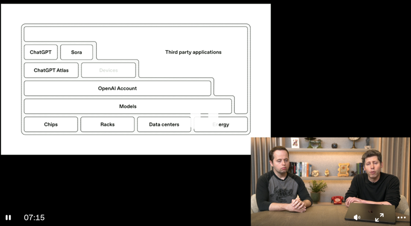 随着 Sora 模型的迭代和 AI 浏览器 ChatGPT Atlas 的推出,OpenAI 的产品线越来越丰富。OpenAI 到底想要打造一个什么样的产品矩阵?这一次,Sam Altman 也通过一张产品矩阵图给出了比较明确的回答。「传统上我们的一些产品表现为ChatGPT内部的 AI 超级助手。但我们不会仅仅停留在自身进化,而是要成为一个平台,让其他人可以在其上构建。」Sam Altman 提到,希望 OpenAI 成为一个平台,一条通往「AI 云」的道路。他还谈到自己的理念来自于比尔·盖茨的名言:当你平台上构建者所创造的价值超过平台构建者本身时,你才算建立了一个平台。因此,明年 OpenAI 希望通过技术、用户群以及构建的框架,让全世界都能在其上构建出色的新公司、服务和应用程序。