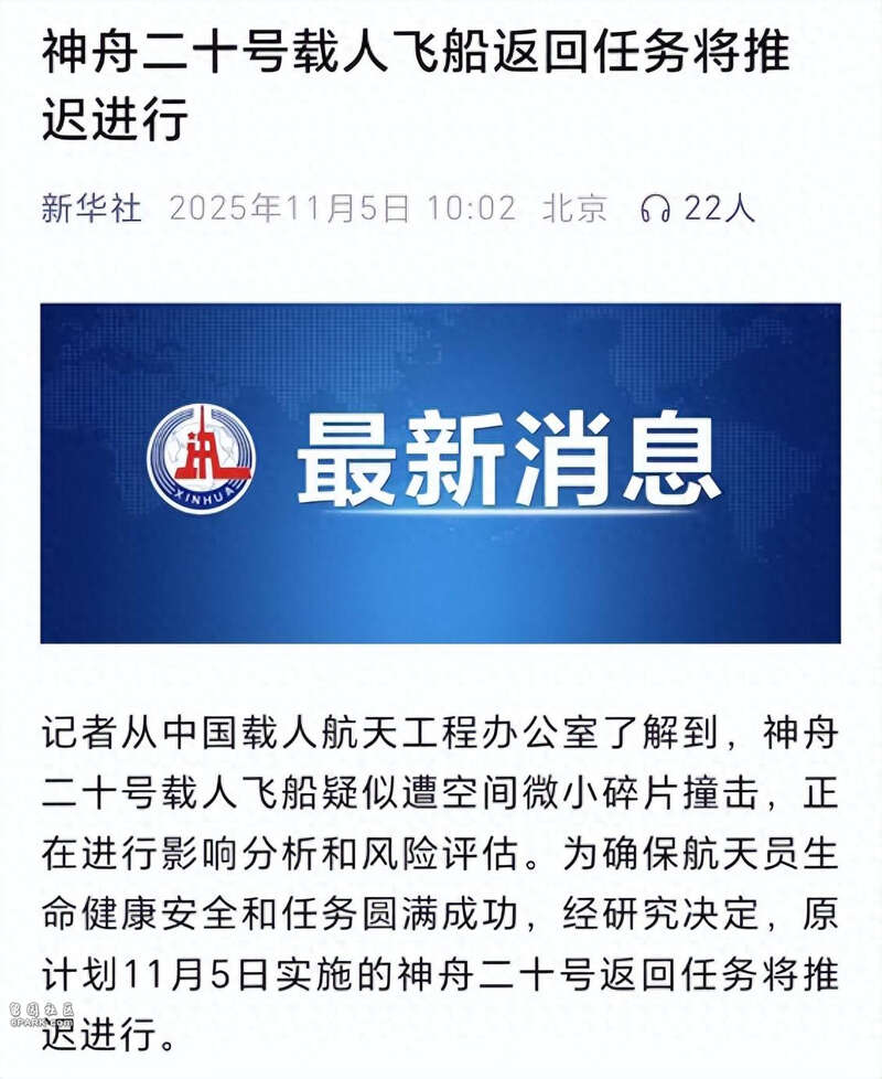 事情来得相当突然。神舟二十号今年4月24日上天,指令长陈冬是老航天员了,另外两位都是第一次上太空。在轨工作半年后本该11月5日回家,地面最后一次全系统演练都搞完了,家属也安排好了,结果临门一脚出了岔子,飞船上的监测系统发现了异常。工程团队需要时间查清楚飞船到底伤到哪儿了,伤得重不重,会不会影响返回时的气密性和热防护。