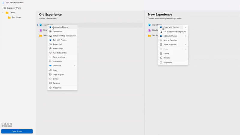该新功能由WinUI3控件驱动,适配于最新的Windows App SDK。SplitMenuFlyoutItem让上下文菜单更具混合属性,左半部分为主要操作,右半部分为带下拉箭头的副操作。例如普通图片文件,“用Photos打开”是主操作,“用Paint编辑”等次操作则归入右侧子菜单。系统还能依据历史使用习惯,将最常用工具智能置顶显示。