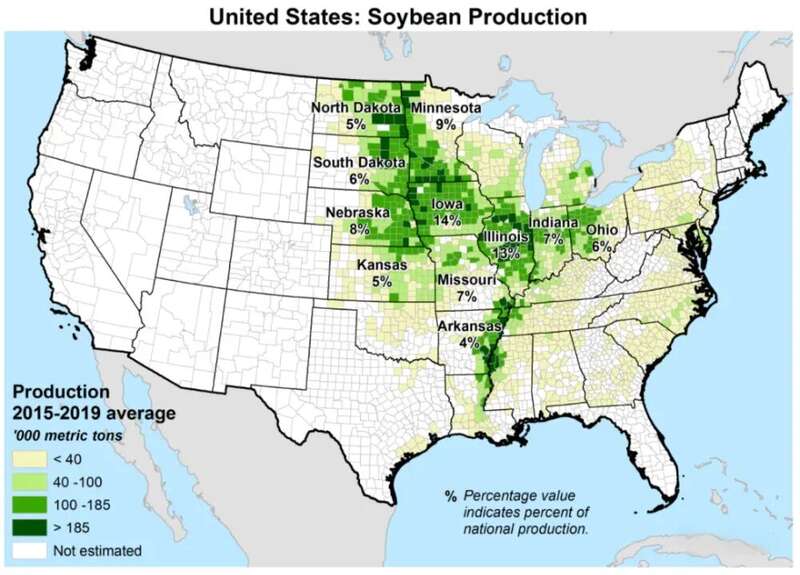 美国大豆主产区(2015-2019年平均产量)