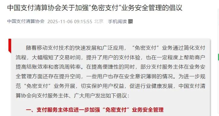 因此,协会倡议,支付服务主体应进一步加强“免密支付”业务安全管理,具体包括:杜绝默认开通行为,提供限额管理功能,在显著位置提供“免密支付”一键取消功能等。同时,协会倡议,用户应定期检查免密支付签约情况等。