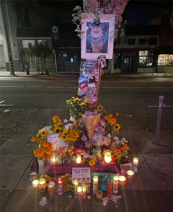还有旧金山居民在事故现场设立临时祭坛,摆放鲜花和KitKat照片,称其为 “硅谷的金丝雀”(警示科技风险)。