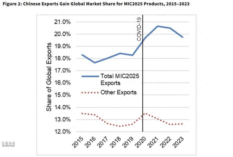“2015年至2023年(全球贸易最新可用数据年份),中国企业占MIC2025十大相关领域全球出口增长的近四分之一,”报告写道,“2023年,中国出口了价值1.5万亿美元的MIC2025相关产品,占全球同类产品出口总额的近 20%。”