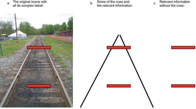 想象一条伸向远方的铁轨,两条铁轨线在视野尽头汇合。如果在两条铁轨之间放两个同样长度的枕木,位于远处(也就是铁轨间距更窄处)的那个枕木,看起来会比近处的更长。这就是庞佐错觉的经典演示 。